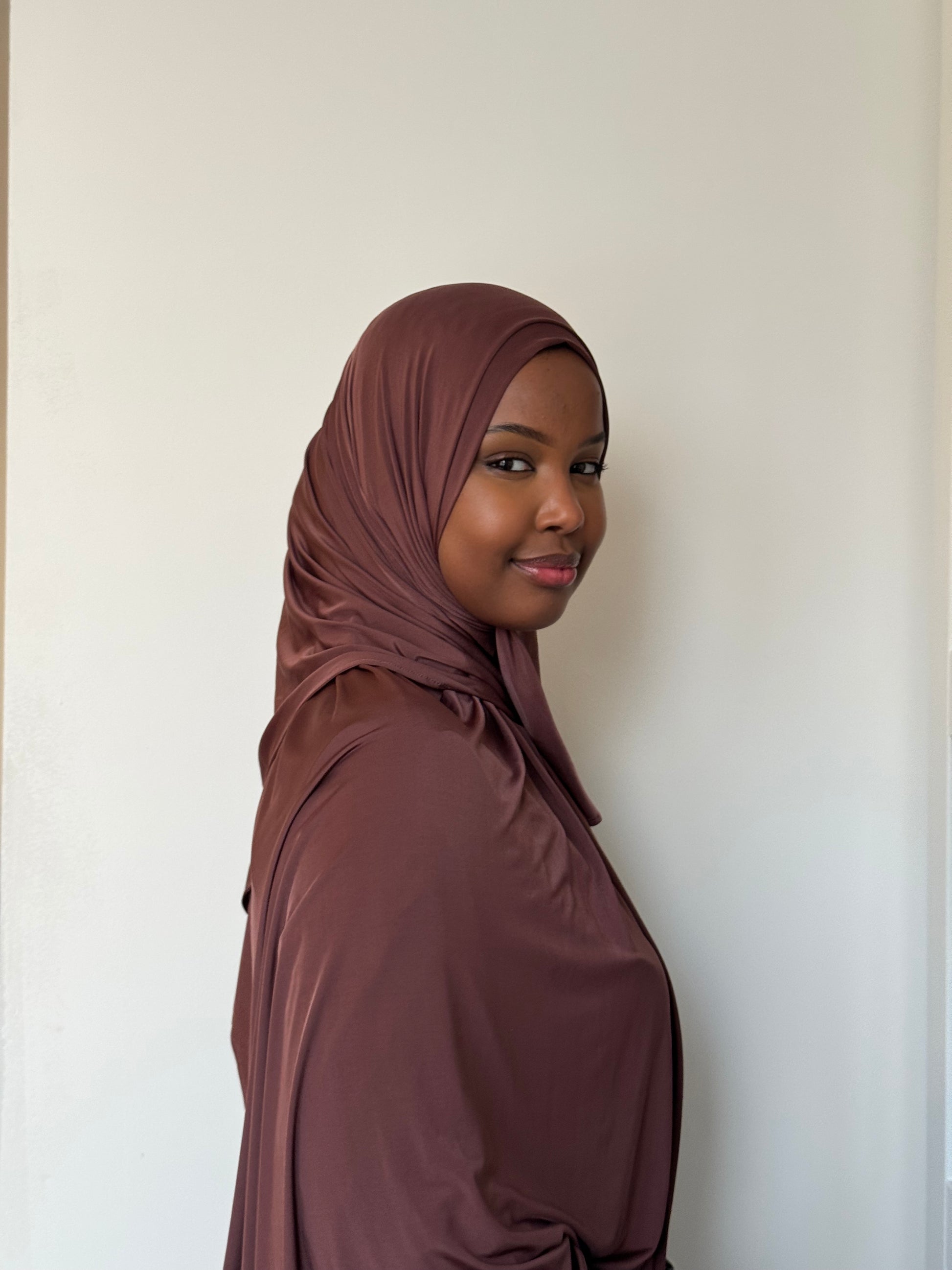 This jersey hijab features a refined natural sheen. Due to the fabric’s composition, the surface may reveal a subtle water-ripple effect when exposed to light.